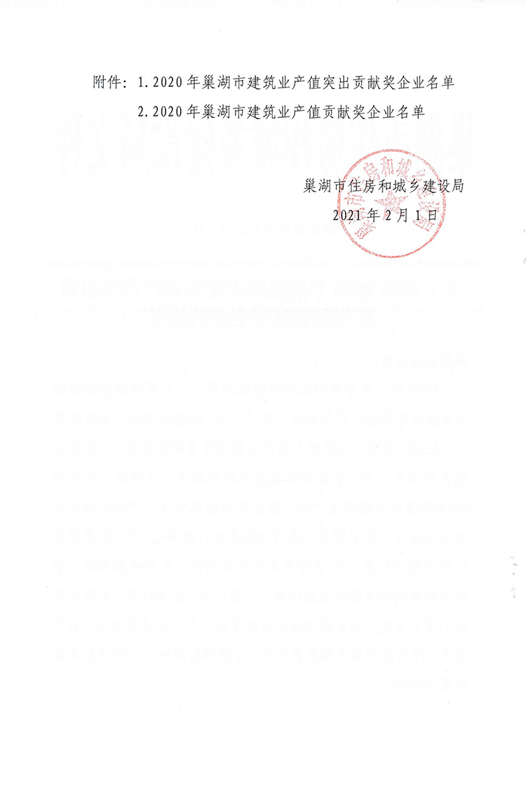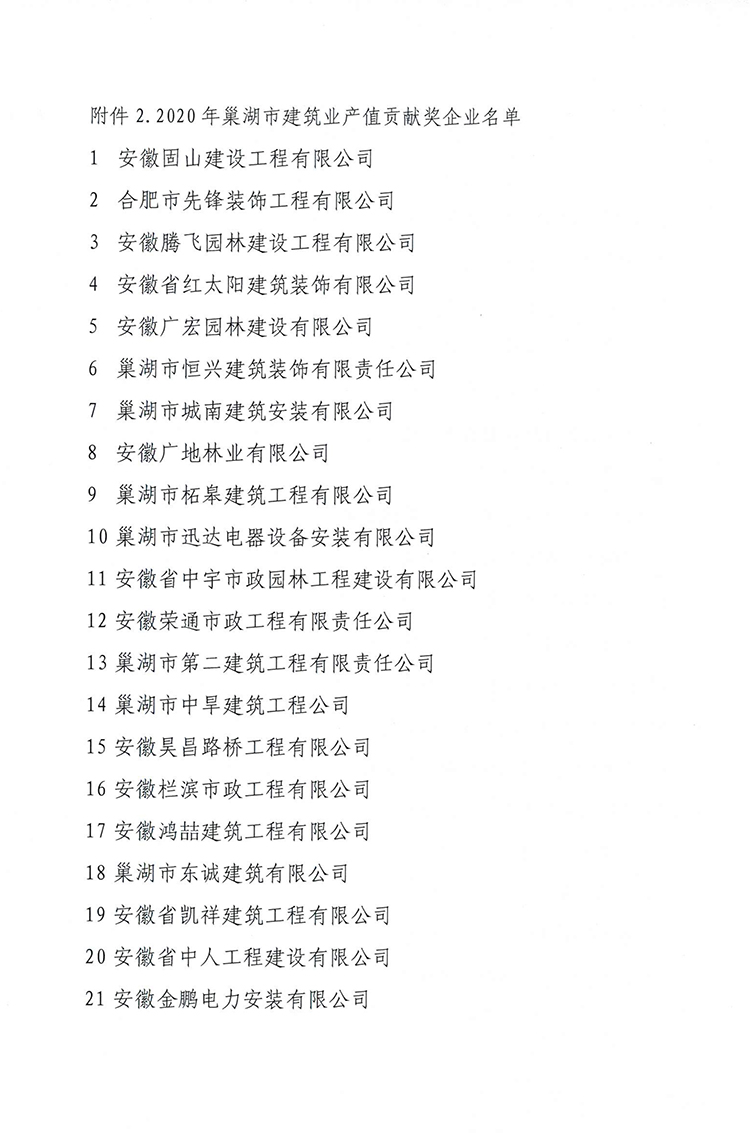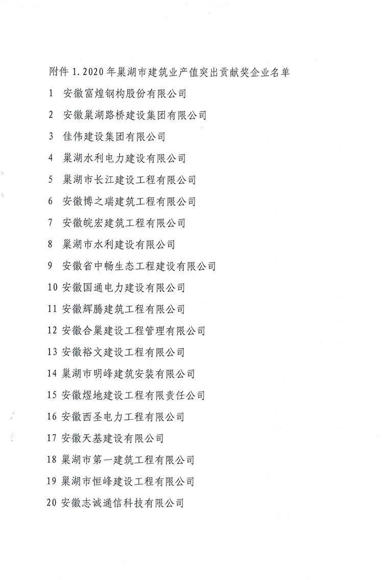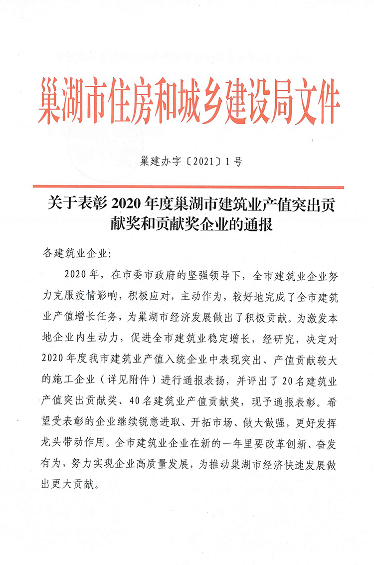 巢建辦字〔2021〕1號關于表彰2020年度巢湖市建筑業產值突出貢獻獎和貢獻獎企業的通報